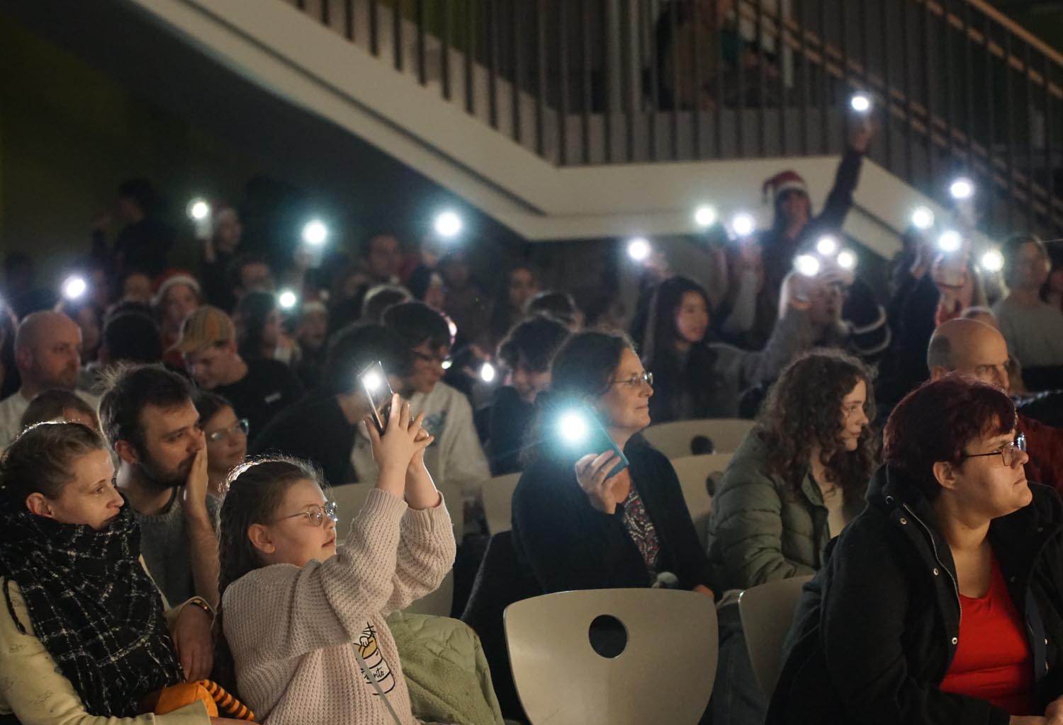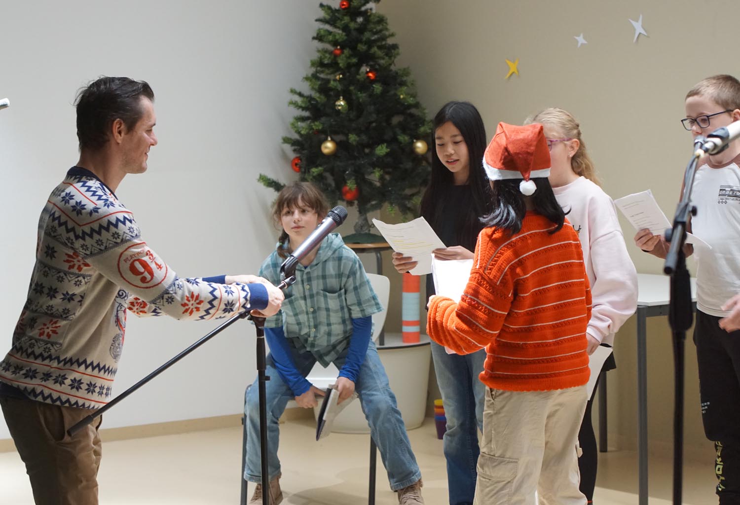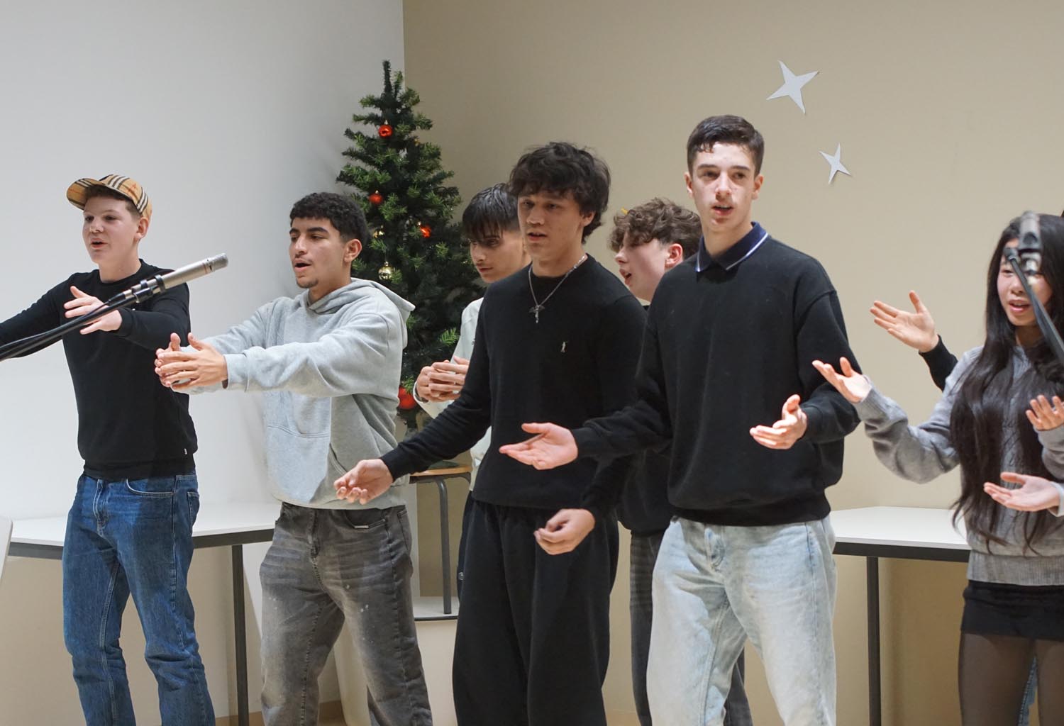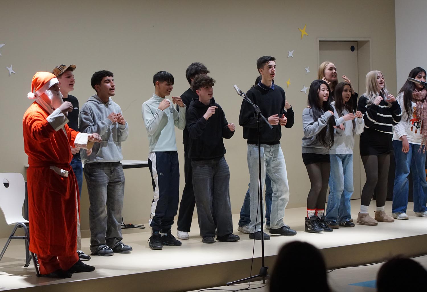 Unsere Schüler und Lehrer übten wochenlang, um allen Anwesenden eine grandiose Show zu bieten. Und so wurde es am 11. Dezember 2025 mit Gesang und instrumentellen Stücken mal andächtig leise und rhythmischen Stücken und einem großen Finale der Fischer Allstars ganz laut. Besonders stolz sind wir auf unsere internationalen Beiträge. Unsere DAZ-Schüler haben ein kleines Theaterstück aufgeführt, es gab „A Christmas Carol“ in der Originalsprache und unsere Musiklehrerin spielte noch ein französisches Weihnachtslied.